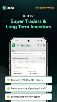 धन, 10 लाख से अधिक उपयोगकर्ताओं द्वारा विश्वसनीय, ट्रेडर्स और निवेशकों के लिए डिज़ाइन किया गया पसंदीदा ट्रेडिंग ऐप है। यह तेज़ गति, उन्नत उपकरण, बेहतरीन विश्वसनीयता और शानदार ग्राहक सहायता प्रदान करता है, जो आपके ट्रेडिंग अनुभव को बेहतर बनाता है।